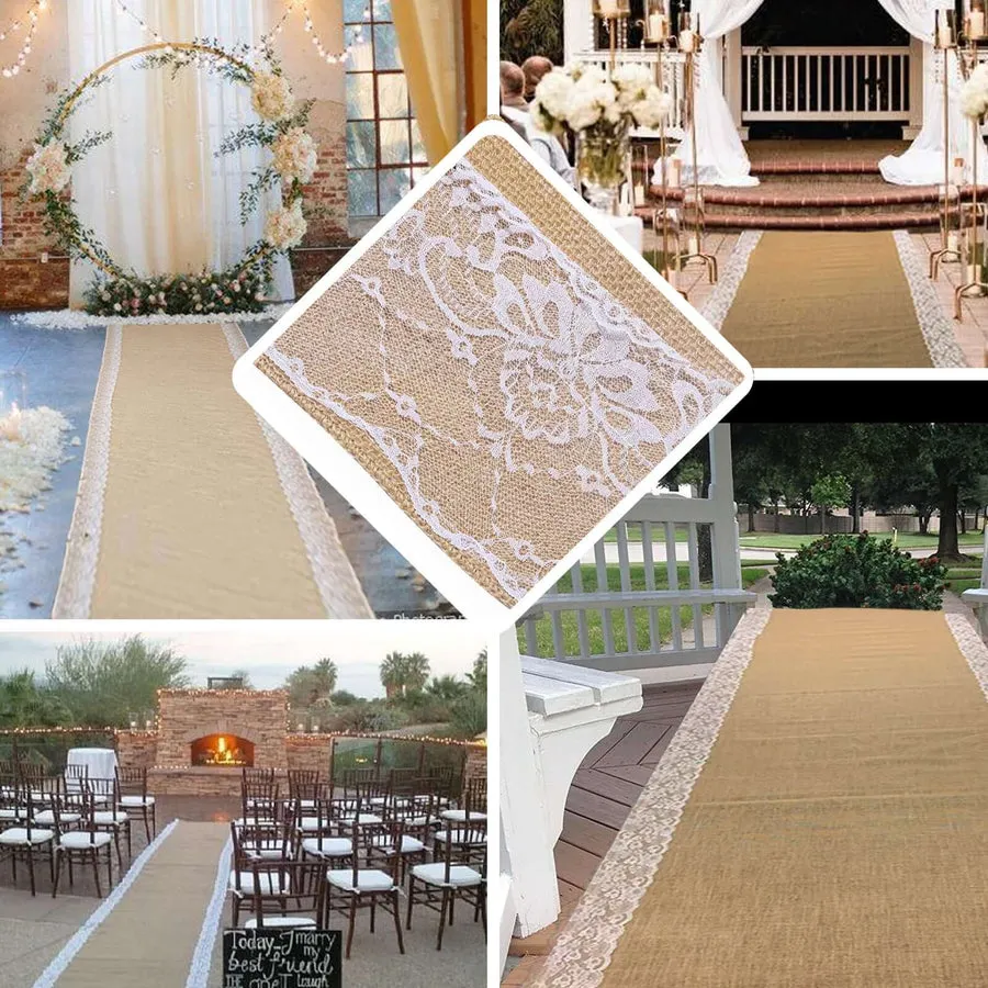 Add rustic elegance to your wedding ceremony with this Natural Jute Burlap Aisle Runner with White Floral Lace Borders. Crafted from high-quality, heavy-duty burlap, this aisle runner brings a natural, earthy charm that is perfect for beach, garden, barn, or indoor weddings. The delicate white floral lace borders beautifully contrast with the natural jute, adding a soft and romantic touch to the overall look.